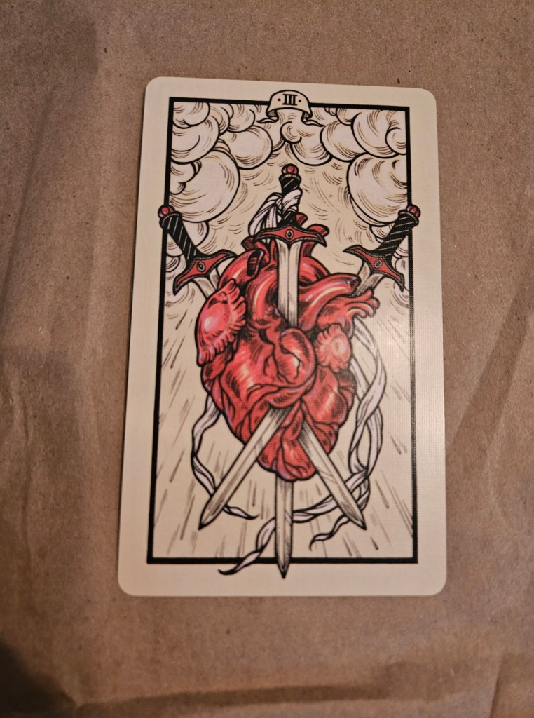 Heartbreak is a major keyword for the Three of Swords, as is separation. Loss and sorrow is heavily felt, often because of misunderstanding and willful fighting. This loss is a lesson learned in tempering one’s expression, as well as understanding power and aggression. One of the few swords cards that is quite emotional.