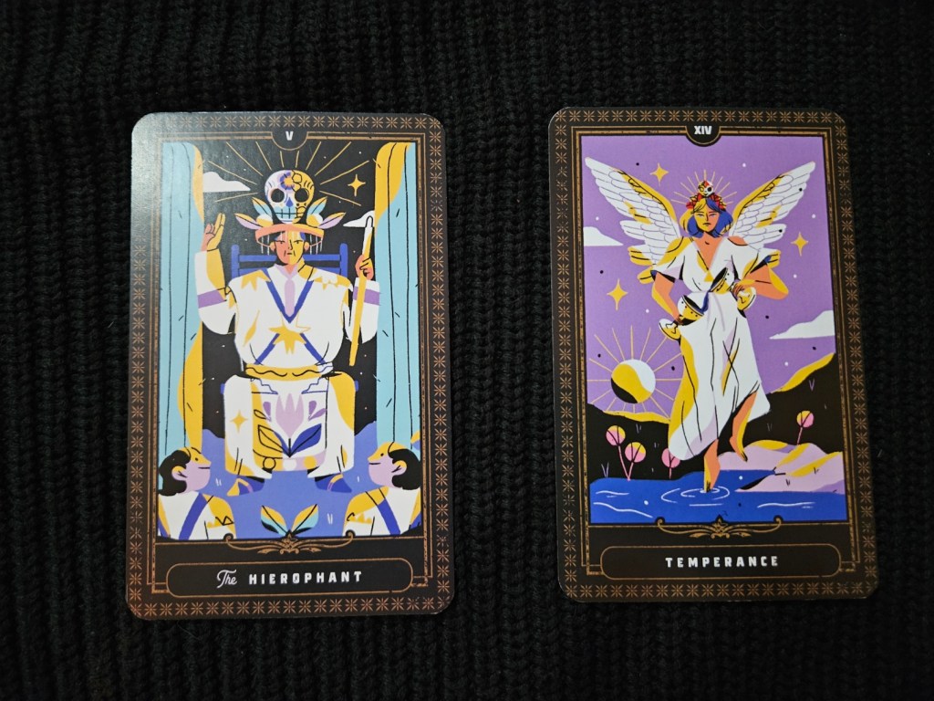 Temperance (XIV) is more pure in its representation of radical change. This is Major Arcana #14, in which its numbers at to 5. Temperance, while it does value moderation and patience, is the opposite of the Hierophant. With an openness to experimentation and a need for alchemy, this card welcomes paradoxes. The angel represented on the traditional card is shown as intersex and is depicted pouring water in a diagonal line without a single drop out of place, like its magic.