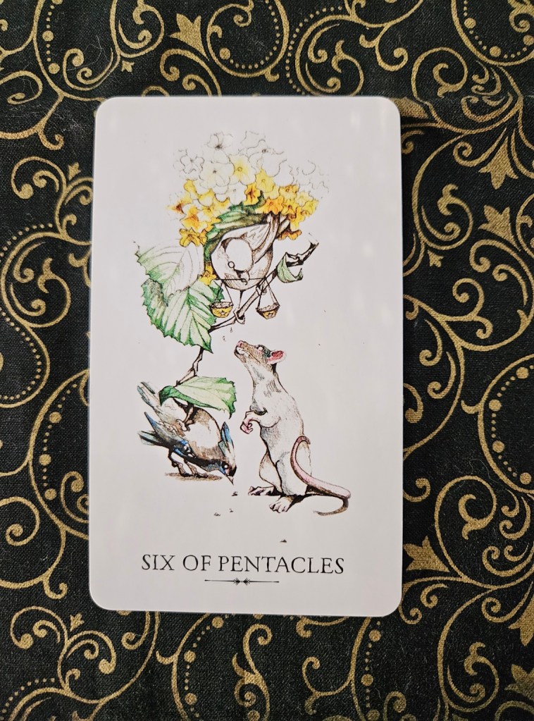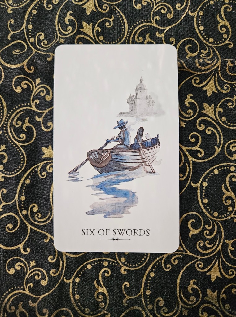 As for the Six of Swords or Six of Pentacles in the traditional RWS, you can see both of these motifs playing out simultaneously. In the Six of Swords, the figure is leaving an old unsafe place and making their way to a newer place, hoping it’s somewhere more comfortable and safe. The Six of Pentacles also indicates concerns for safety and security, mostly coming from material resources and community care. The Six of Pentacles always shows a giver and a receiver, and usually you know which one you are when you pull this card.